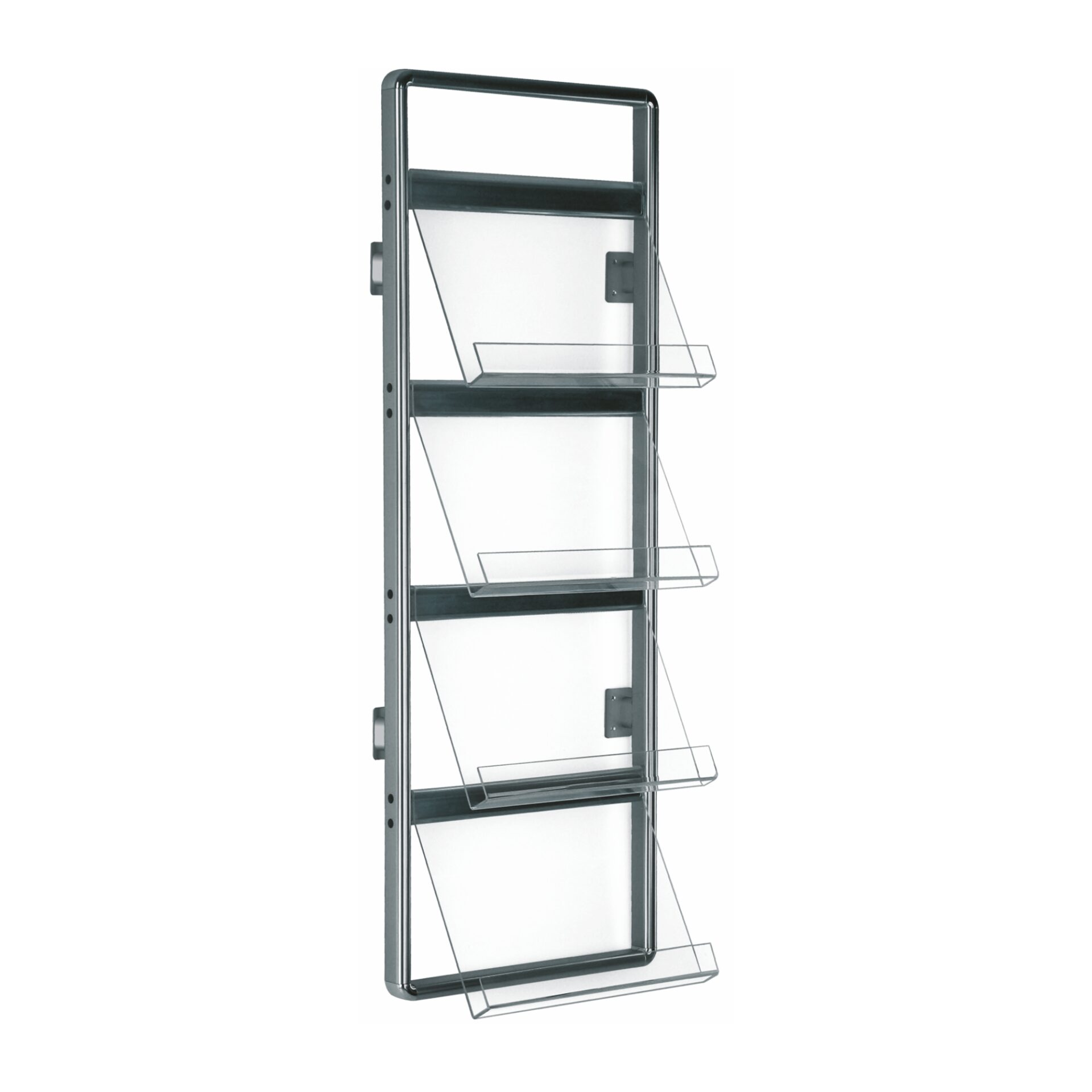 Duvar tipi broşürlük 8 broşör kapatinesine sahiptir. Mağaza, galeri, banka, market vss. gibi yerlerde kullanılan dekoratif bir üründür. Tüm rafları kolayca takıp çıkartabilirsiniz. Gövde alüminyum, raflar 3,8 mm şeffaf akriliktir.