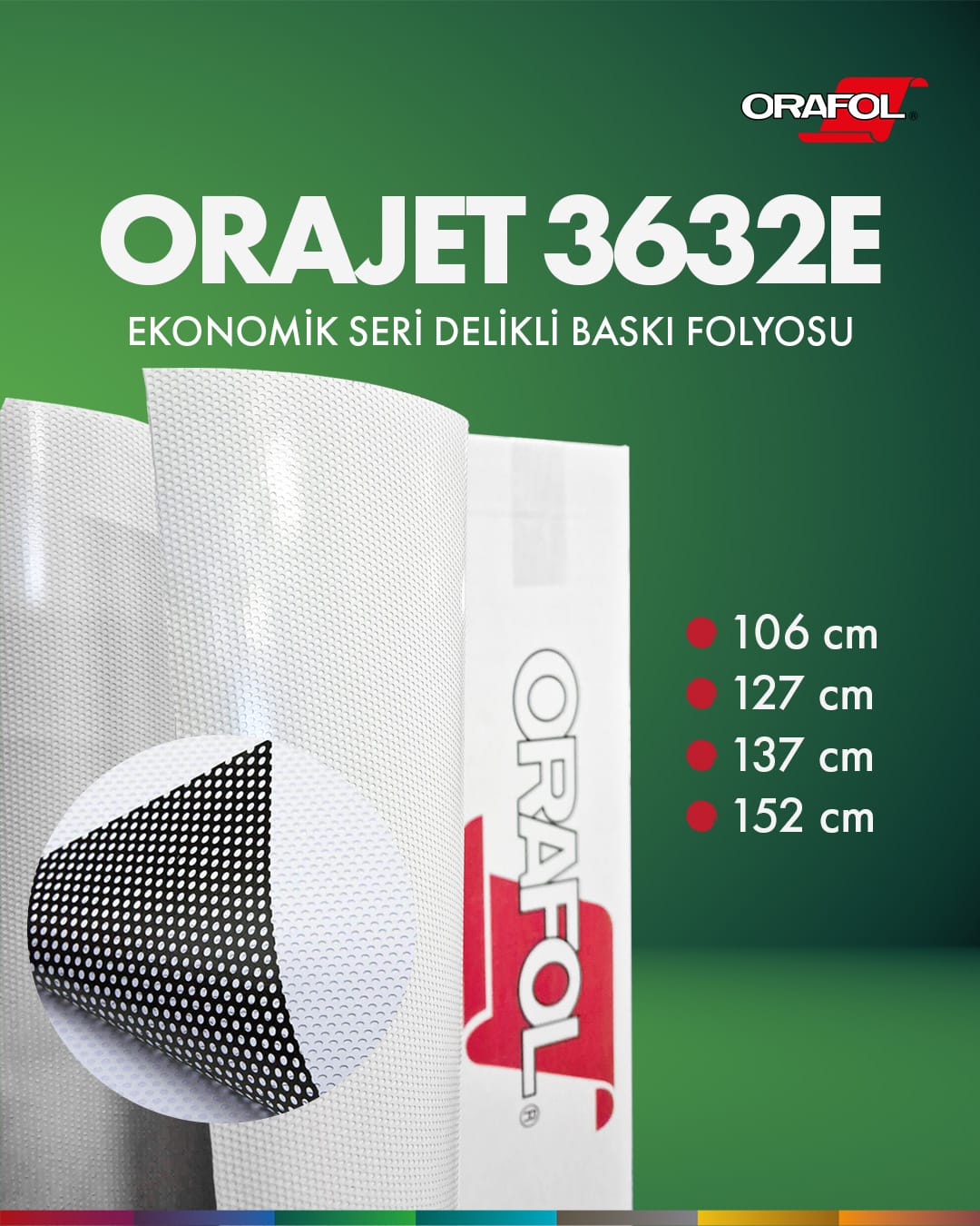 Kullanım Alanı : 1,5 mm delik çapı %50 Baskı alanı. Araçlarda, vitrinlerde veya düz yüzeyli, şeffaf reklam araçlarında kısa ve orta vadeli reklam grafikleri için ideal. Kuru uygulama gerektirir. Tavsiye edilen laminasyon folyoları; Oraguard 297 GF